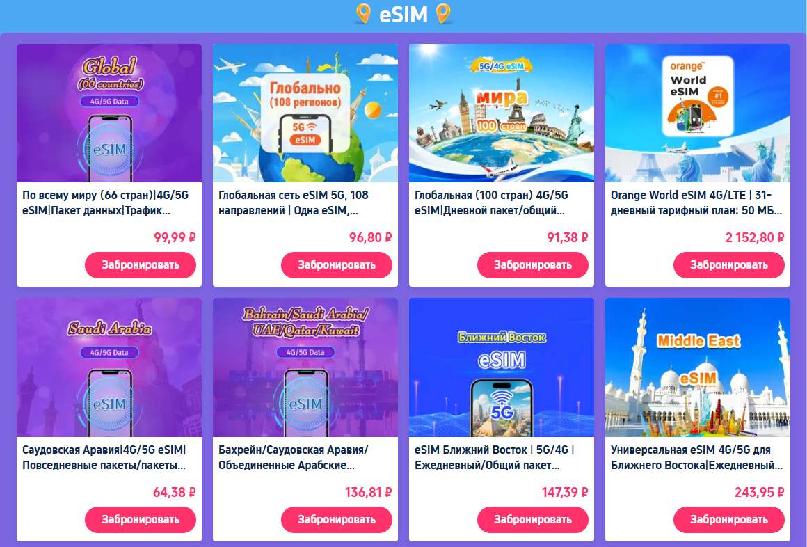 Больше не нужно менять SIM-карты в поездках! Выбирайте удобные тарифы eSIM для любой точки мира. У нас есть глобальные пакеты (до 108 регионов), специальные предложения для Ближнего Востока, а также пакеты для Саудовской Аравии, Бахрейна, ОАЭ и других стран. Получите 4G/5G интернет сразу после приземления.