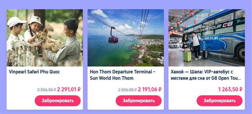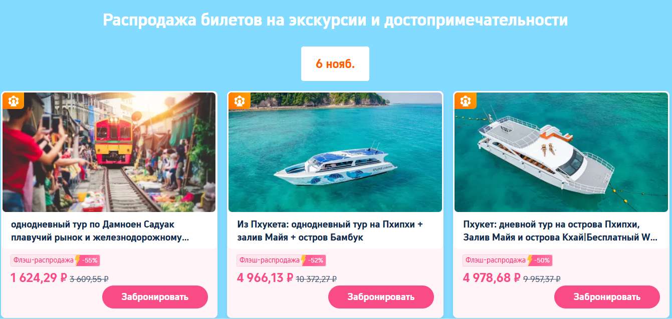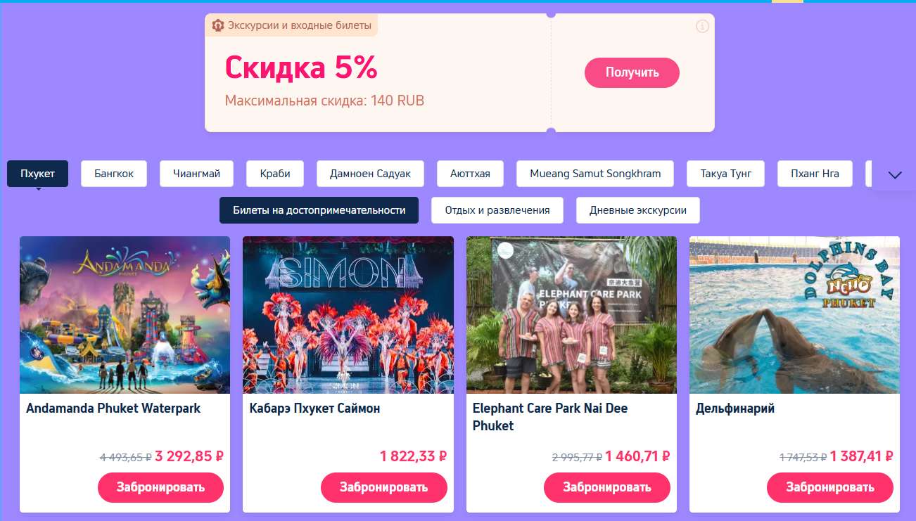 Откройте для себя весь Таиланд с выгодой! Получите скидку 5% на экскурсии и входные билеты во многих популярных городах, включая Пхукет, Бангкок, Чиангмай, Краби и Аюттхая. Просто нажмите «Получить», чтобы воспользоваться предложением (максимальная скидка — 140 рублей). От аквапарков и кабаре-шоу до заповедников слонов — спланируйте свой идеальный отдых!