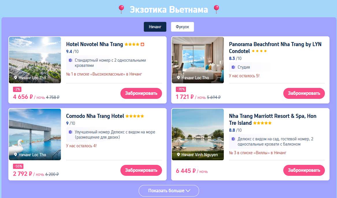Откройте для себя Вьетнам с невероятной выгодой! Мы предлагаем горящие предложения в Нячанге и на Фукуоке. Насладитесь роскошным отдыхом в Panorama Beachfront Nha Trang со скидкой 70% или в Comodo Nha Trang Hotel со скидкой 23%. Также доступны билеты на Vinpearl Safari и канатную дорогу Hon Thom.