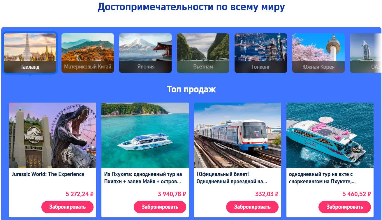 Ознакомьтесь с нашими хитами продаж со всего мира! В этом разделе собраны самые популярные предложения из таких стран, как Таиланд, Материковый Китай, Япония и Гонконг. Среди наших бестселлеров: захватывающее приключение Jurassic World: The Experience, классический однодневный тур на острова Пхипхи, удобный однодневный проездной на [транспорт] и роскошный тур на яхте со сноркелингом на Пхукете.