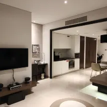 Я подъехал к входу в отель и дважды его искал. Навигатор указал на кольцевую развязку у входа, но на самом деле там есть подземная развязка, похожая на вход в туннель. Указатель вёл прямо к башням Этихад, но я её не заметил. На территории отеля есть бесплатная парковка. Лобби огромное. На стойке регистрации нам предложили апартаменты, но, к сожалению, они находились на втором этаже. Номер был большим и удобным, с собственной аудиосистемой Bose. Кухня была полностью оборудована посудой, плитой и стиральной машиной. Ванная комната была оборудована туалетными принадлежностями BYREDO, что было очень здорово. Столовая была большой и предлагала широкий выбор блюд, все отличного качества. Можно было заказать свежевыжатые фруктовые и овощные соки, а также кофе с собой. На 74-м этаже есть открытая смотровая площадка, но номер не предоставлял неограниченного доступа. Мы выбрали ночной и дневной вид. Он находится прямо напротив восьмизвёздочного отеля Royal Palace, откуда открывается вид на Президентский дворец и другие здания. Вид на Абу-Даби действительно потрясающий!