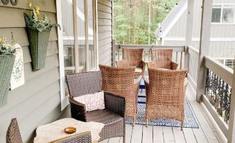 The kitchen on the Main Level is equipped with a commercial grade prep table for cooking, refrigerator, microwave, stove/oven, and a dishwasher. It includes flatware, cooking utensils, pots and pans, glassware, and staple pantry items/spices/condiments. A coffee pot and Keurig are available as well as your basic small kitchen appliances. A bar table and stools looks out to the backyard, and a slider patio door to the furnished back deck makes it easy access to enjoy outdoor dining.