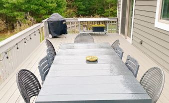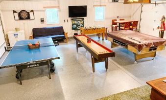 The attached heated finished garage (no cars allowed) is outfitted as a game room featuring ping pong table, pool table, shuffleboard, darts, foosball table, cornhole, card table/chairs, ice chests, and 55" flat screen smart TV w/ soundbar. Feel free to open up both garage doors, use the grill, full use of the furnished back deck that's the length of the house, and fire pit with Adirondack chairs to toast s’mores!