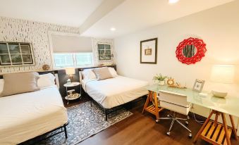 The Queens Room features three queen beds and can sleep 6. Room includes desk, flat screen smart TV, closet, dresser, and is located on the Lower Level of the house.