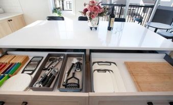 Kitchen & Dining: A full kitchen, boasting state-of-the-art appliances, enables you to prepare gourmet meals with ease. Enjoy your culinary creations at the stylish dining island, perfect for both quick breakfasts and intimate dinners.