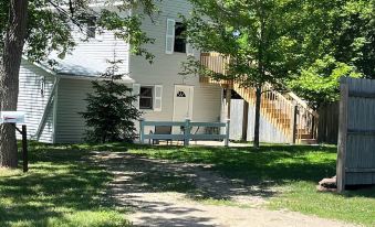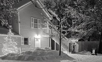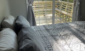 The first floor has an open floor plan with room dividing curtains separating the sleeping areas which include a queen-size bed and full-size bed. The first floor has a full bathroom with a bathtub and shower.