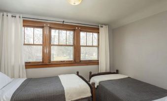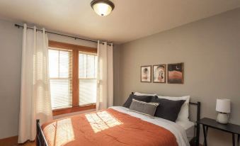 You’ll walk through the front door into a 3-season porch where you can enjoy your morning coffee as you wait for the sun to rise. The porch opens up into the sunroom furnished with a working/writing desk station. Through French doors, you’ll find the dining room with a large dining room table, the living room with a Smart Roku TV, a well-stocked kitchen, and a master bedroom/ half bath. Up the stairs are three additional bedrooms and a three-quarter bathroom. Original hardwood floors flow throughout most of the home and each bedroom has its own chic, boho style. If you’re feeling crazy, put the phone down and grab one of the board games out of the basket in the upstairs hallway or a local magazine out of the dining room! The washer and dryer are located off the kitchen if needed. The bungalow is set up to assure you’ve got a fun place to make memories and a restful place to land at the end of the day!