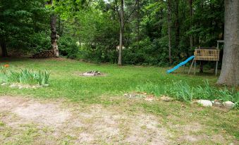The property also includes a gas grill for barbecues, a picnic table for outdoor dining, and a fire pit for cozy evenings. A row boat and a canoe are provided for lake adventures. The lakefront has a soft sandy bottom for swimming. Younger guests will enjoy the play set in the yard.