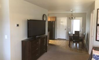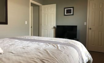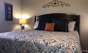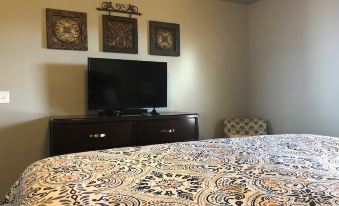 KING SUITE: The King Suite is a 192 sq. ft. room featuring a king size bed with 14" plush memory foam mattress, nightstand, lamp, sleep sound machine with alarm clock, dresser, mirror, computer desk with lamp and chair, 39" flatscreen TV and ceiling fan. The suite has a private bathroom with a shower and a large walk-in closet. This room accommodates two guests.