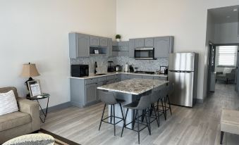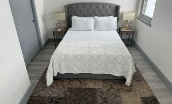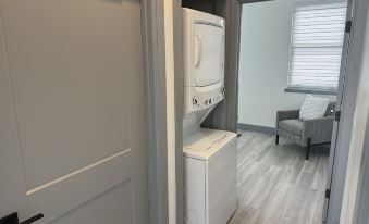 Fully furnished, free wifi, luxurious vinyl flooring with radiant heat, granite countertops through entire house, full kitchen with basic utensils and essential cooking equipment, beautiful granite island counter sits 6, stainless steel appliances, stacked washer and dryer, large flat parking pad for multiple cars, zebra blinds, 2 bedroom, one bath, full kitchen and living area. For your safety and ours outdoor security cameras.