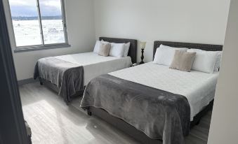 Bedroom 2- two queen bed, night stands with usb connection, rug, controlled fan and light, full closet, bench, view to the ski run.