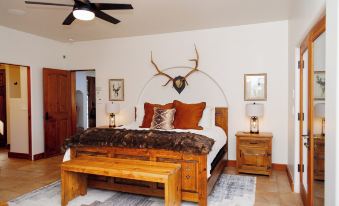 Inside, you’ll find four luxurious king suites, a bunk room with custom-built beds, and ample sleeping space for everyone. Each room is thoughtfully designed to offer a peaceful, private retreat after a day of mountain exploration. For added convenience, a working elevator, high-end appliances, coffee bar, and dual washer/dryer sets are ready to make your stay effortless.