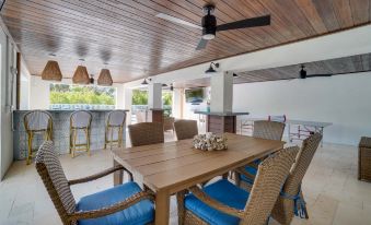 Located on a corner lot in a quiet neighborhood, Coconut Cove is surrounded by mature palms, a lush green lawn, and plenty of open space. In the main living area, brand new furnishings, wood floors, and vaulted ceilings create an open, airy space to kick back in front of the large flatscreen. The formal dining room sits nearby, with seating for eight.