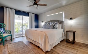 The primary suite is like a sanctuary within the home— complete with a king-size bed set against a charming white shiplap wall and a woven headboard. Pops of indigo blue and teal add beachy charm, while a glass sliding door allows access to the private balcony. In the stunning ensuite bathroom, a freestanding marble tub sits inside a blue-tiled, glass-enclosed “wet room” that also includes a spa-like shower. The double vanity has glass bowl vessel sinks.