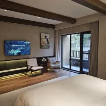 Сотрудники службы поддержки клиентов на стойке регистрации заранее связались с нами через WeChat, чтобы узнать время прибытия гостей, и организовали машину с водителем, чтобы забрать их заранее. Персонал на станции встречи был очень дружелюбным и взял на себя инициативу помочь нам с багажом. Они также взяли на себя инициативу по ознакомлению с окружающим пейзажем. Нас доставили ко входу в B&B на живописном автобусе-шаттле. Персонал на стойке регистрации был приветливым и дружелюбным. Территория отеля очень красивая. Он находится в живописном районе Эндури. Процедура регистрации прошла очень быстро, и сотрудники помогли с багажом и проводили нас в номер. На первом этаже есть собственный дворик со столами и стульями, что очень уютно. Также есть приветственные закуски. Вечерний фейерверк на третьем этаже отеля был потрясающим. Утром нам нужно было сесть на поезд, и в ресторане приготовили завтрак. В отеле также есть зонтики, столы и стулья на открытом воздухе. Впечатления были отличными.