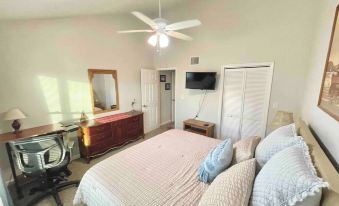 Downstairs room: king bed, flat screen TV, desk space, closet.