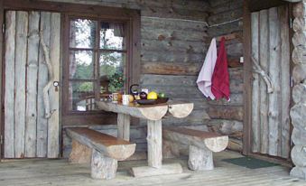 Log cabin 1981, renovated 2002, kitchen, lounge with fireplace, bedroom with bunk bed, bedroom with double bed, sauna, dressing room, washroom, open veranda. Portable charcoal BBQ grill. Coal