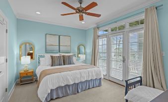 King bed with calming indigo decor and view of town of Atlantic Beach