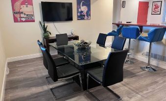All hard surfaces on the floors, tile downstairs and in the bathrooms with luxury vinyl planking in the common spaces and bedrooms. There is a custom built wooden bar top/breakfast nook for guests to enjoy and eat at. The space has a funky diner vibe to it.About pets:No pets allowed.About checkOut:Check out before 11:00 AM.About children:Children allowed: ages 3-17.About checkIn:Check in after 4:00 PM.About smoking:Smoking is not permitted.About events:No events allowed.