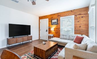 * King & Queen bed option, fiber internet with work desk, 65" smart TV, stocked kitchen (air fryer, hot water kettle, coffee, toaster, etc.)