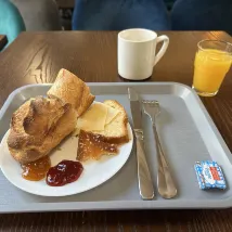 Обслуживание: Персонал очень дружелюбный и отзывчивый. Номер и ванная комната были очень чистыми, явно регулярно убирались – большой палец вверх! Утром был предложен простой завтрак: хлеб и горячий кофе, достаточно, чтобы сытно поесть.