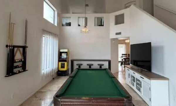 The house has 3 bedrooms, 2.5 baths, 2 living rooms, 2 couches, a game room with pacman/a large dart board and pool table, kitchen, and outside patio sitting area.