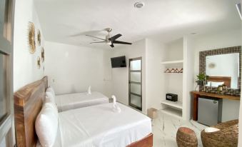 Very modern rooms in a more rural mexican town. Its quite far from the bus terminals however most things are - its situated well near the Centro of Bacalar though. Most lagoon tours start from a fair walk away too from the hotels along the coast further down the road (approx 20-30minutes), but its safe enough. The hotel itself has tinted black windows for rooms but also blinds so there is plenty of privacy. Hot water, clean rooms and beds and a fridge too. No 24 hour reception though.