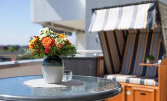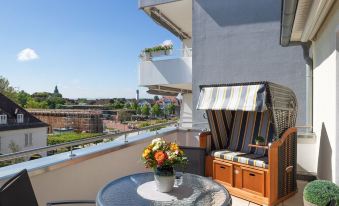 Sehr sauber und tolle Aussicht vom Balkon auf Salinen und Kurpark. Sehr schöne runde Sitzmöbel. Tolle Schlafzimmer.