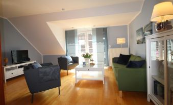 3 room apartment, upper floor, approx. 75 m². Internal stairs to the 1st Upper floor: hall. Living room with sofa and double fold-away bed, balcony exit. Kitchen (4 ceramic hobs, oven, microwave, dishwasher, refrigerator, coffee capsule machine, kettle, toaster). Double room. Single rooms. Bath / shower / WC. South-facing balcony with furniture Parquet in the living area, laminate floors in the sleeping areas. 2x cable TV, digital radio, DVD player, internet access (WLAN, included). Gas central heating,