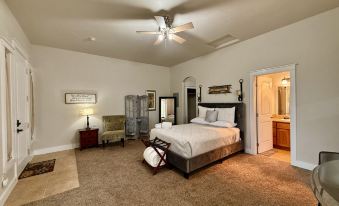 Escape to a cozy retreat in our charming casita, designed to offer you tranquility and comfort. This inviting studio features a queen luxury pillowtop mattress and a well-equipped kitchenette with a mini fridge/freezer, coffee maker and microwave, perfect for preparing light meals. The large windows fill the space with natural light and provide beautiful views of the landscaped surroundings. Step outside to relax by the firepit, where you can enjoy your morning coffee or unwind under the evening sky.