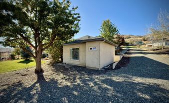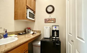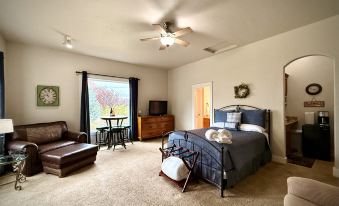 Escape to a cozy retreat in our charming casita, designed to offer you tranquility and comfort. This inviting studio features a queen luxury pillowtop mattress and a well-equipped kitchenette with a mini fridge/freezer, coffee maker and microwave, perfect for preparing light meals. The large windows fill the space with natural light and provide beautiful views of the landscaped surroundings. Step outside to relax by the firepit, where you can enjoy your morning coffee or unwind under the evening sky.