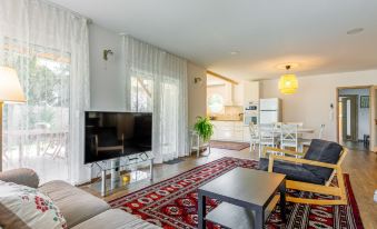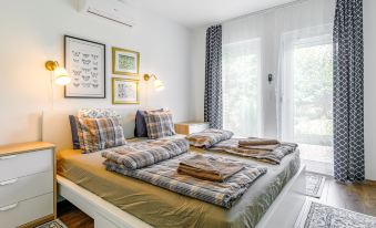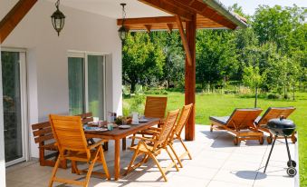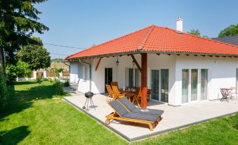 Balatonöszöd 28 km from Siófok: Beautiful house "Sunstreet", built in 2021. In the resort, in a quiet, sunny position, 800 m from the lake, 800 m from the beach. In the house: WiFi, washing machine. Grocery 800 m, supermarket 3 km, restaurant 800 m, bar, bakery 1.8 km, café, bicycle rental 1.5 km, bus stop 300 m, railway station 1.8 km, grass beach 800 m, thermal baths "Csiszta" 30 km. Surf school 1 km, sailing school 3 km, tennis 4 km, riding stable 12 km, cycle lane 600 m, children's playground 600 m, fishing possibilities 800 m. Nearby attractions: Hévíz 60 km, Siófok 28 km, Kőröshegyi Lavender Visitor Center 10 km, Bella Theme Park 35 km, Kincsesréti Fishing Lake 6 km. 4-room house 180 m2. Beautiful furnishings: entrance hall with air conditioning. Large living/dining room with 2 sleeping facilities, cable TV, wood-burning stove and air conditioning. Exit to the terrace. 1 room with 1 double bed (200 cm, length 200 cm), air conditioning. 1 room with 1 double bed (180 cm, length 200 cm), air conditioning. 1 room with 2 beds and air conditioning. Open kitchen (4 hot plates, dishwasher, microwave, freezer). Bath/WC, shower, sep. WC. Air-conditioning. Solar power. Large terrace 55 m2. Terrace furniture. Facilities: children's high chair, baby cot (extra). Parking (fenced 3 cars).
