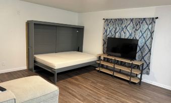 The basement level has a second living area with a full-size murphy bed and a sofa that pulls out to a sleeper. There is also a full bathroom.