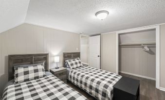 Two additional bedrooms are located upstairs. One room has a queen size bed, the other has two twin beds. Nestled between the bedrooms is bathroom with a tub (not a shower).