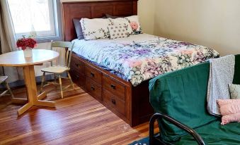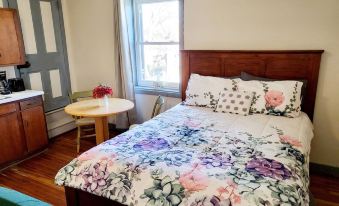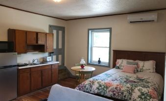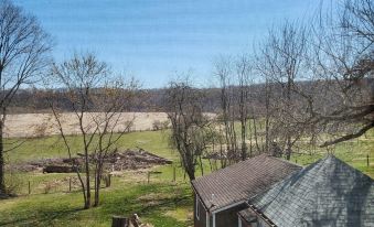 Welcome to the Caretakers Room on the 2nd floor of the historic Manor House at Gayfield! The Caretakers Room is private, situated with a queen size bed, and affords views in two directions of the farm. With modern heating and air conditioning, a rustic 1960's tub and spa style vanity, and a kitchenette with appliances the room is comfortable and accommodating. The Caretakers room also has a large closet and lots of storage in the drawers in the bed!