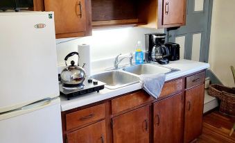 The kitchenette is set up with a 2 burner cooktop, and a basic supply of pots, pans and cooking utinsils.