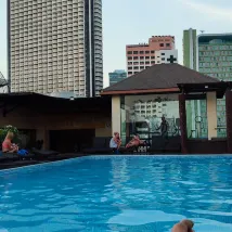 Бассейн - хороший, неглубокий, теплый на верхнем этаже с видом на город