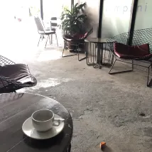 Бесплатный кофе на ресепшене очень даже съедобный. Хорошее местечко на улице со стульями и столиками.