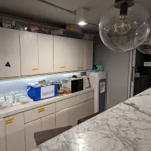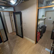 2. Здесь есть несколько рабочих зон. Та, что показана на моей фотографии, — это «общая» рабочая зона, но я думаю, что комната с серой комнатой на той же фотографии ведет в отдельную комнату (думаю, здесь можно проводить совещания, не знаю, насколько она звукоизолирована). Наверху также есть комната с телевизором, если вам нужна более расслабленная обстановка.