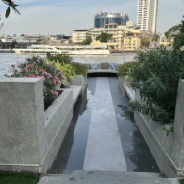 5. Отличное расположение, прямо на берегу реки Чао Прайя. От главного входа до ICONSIAM пешком 15 минут, от заднего входа до ICONSIAM пешком 10 минут (но я не рекомендую идти через задний вход. Хотя это немного ближе, но придется проходить через довольно темные переулки, что для туриста может показаться небезопасным, а также мимо здания, похожего на похоронное бюро. Когда я проходила там впервые, в день заезда, я случайно увидела, как из фургона похоронного бюро вынимали завернутое в белую ткань тело ребенка, и случайно увидела его маленькие ножки, что вызвало у меня очень неприятные ощущения). Поэтому я не советую ходить пешком до ICONSIAM через задний вход.