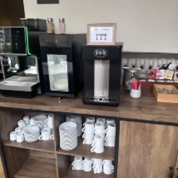 Есть ресторан французской кухни, которым можно пользоваться в течение всего дня, с кофе, молоком и горячей водой. Кстати, их кофемашина позволяет выбирать язык.