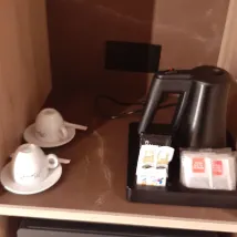 Кометические принадлежности положат только один раз, чайные пакетики каждый день будут обновлять, воду, конфетки, кофе с молоко можно взять внизу на рецелене - бесплатно!