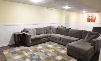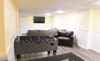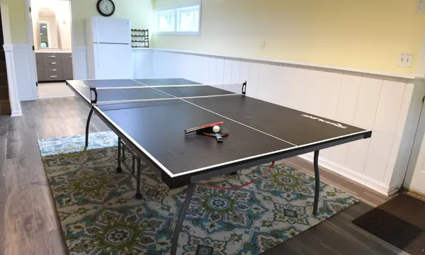 Game Room: Challenge friends and family in the well-appointed game room, featuring a ping pong table, foosball table, dartboard, board games, and 65" smart TV.