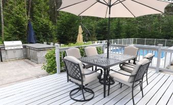 Outdoor Oasis: Relax and entertain in the backyard's private oasis. Swim in the Kayak saltwater pool, cook up a feast in the outdoor kitchen, roast marshmallows over the fire pit, or enjoy a friendly game on the bocce court.