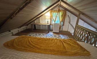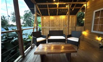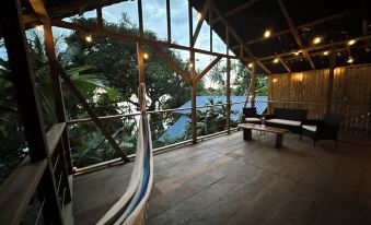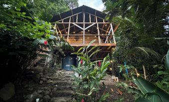 Private waterfront Cabin on the Caribbean Sea. Located on Oceanside in Isla Bastimentos, Bocas del Toro. Casa Serenity By The Sea: Tree Frog House is the highest Cabina on the property and sits amongst the tree tops in a jungle canopy. It has a Studio Loft layout with 320 sq ft of space on the lower level and 224 sq ft of space in the upper level. It has a King size bed upstairs and a Twin size Daybed in the Living Room. Our seaside property has crystal-clear water out front with a beautiful reef for snorkeling. It is within minutes of walking distance to local surf breaks and a 25min hike to the majestic Wizard Beach. We are next door neighbors with “Reggae Bites” and “The Firefly”. Both have excellent dining in a tropical setting on the water (but they are seasonal and cash only***). Other dining options are close by around the point in Old Bank. Chill in the hammock 70’ up on the front deck or in the hammock down by the water while listening to the lapping waves and tropical birds. The hammock out front is on carabiners and can be removed for full, unobstructed use of the circular meditation clearing (we highly recommend doing this during your stay). You can easily snorkel in the clear water directly off the property via the walk-out area. Beautiful coral heads and sea life are abundant on the reef that lines Oceanside (The water is particularly clear in the “Off-Season” months of May, Sept-November. When the waves are down…the Snorkeling is UP!!! REEF BOOTIES & REEF/LOBSTER GLOVES ARE HIGHLY RECOMMENDED!) Multiple world class surf breaks on the nearby islands including Carenero Point and Paunch’s are visible from the property. Float your worries away out front while you watch epic sunsets in true paradise-style. AC and powerful fans have been installed inside and on the deck for comfort. A full kitchen is available for cooking meals with options for electrical or gas powered. Tea kettle and French Press are available for making coffee. Dimmable lighting has been installed inside and out for ambiance. The mattresses are 12" cooling gel memory foam accompanied by down pillows and 100% Bamboo linens. There is a table and bench system for dining. There is also a Ratan loveseat/chairs set and a coffee table on the deck. The beautiful furniture is made from repurposed Nispero and locally grown/hand-hewn Black Laurel wood. Go for a surf and get barreled in crystal clear water. Re-align yourself with nature in this very special place. Everything you really need is either right in front of you or a short boat ride away.