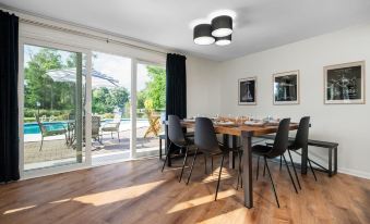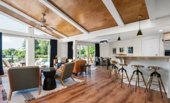 Our home also boasts a fully stocked kitchen and coffee/wine bar, perfect for hosting a 10-person dinner party. Guests can enjoy complimentary coffee, and the kitchen is equipped with stainless steel appliances.