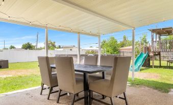 Fully fenced with a patio with outdoor seating, grill, and kids' playset