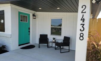 Approaching the driveway, you will feel a sense of wonder and excitement at the sight of this modern turtle themed beach cottage that definitely stands out from the rest. The black, grey, and teal accents reflect our vision, blending elegance and creativity in our local area. You will smile at the hand-made sea turtle shutters that add a touch of personality and charm. Beautiful shrubbery and flowers are planted along the front of the home, adding splashes of color and creating an inviting atmosphere. You and your guests will have plenty of parking.
