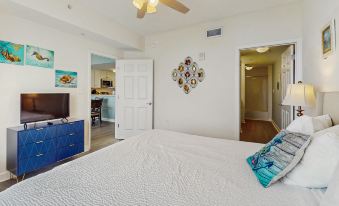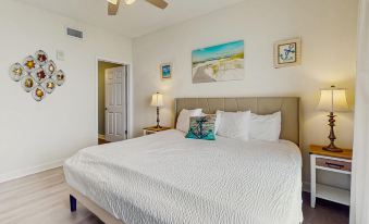 Inside, soft light-blue walls and beachy accents create a calming, coastal vibe, while the light-colored flooring enhances the natural brightness throughout. The spacious and functional layout makes it easy for everyone to relax, including the primary bedroom that opens right onto the balcony, a favorite spot for catching unforgettable sunrises and sunsets over the Gulf.