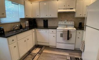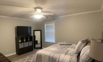This home is located on one level and is great for couples, business travelers and families. Each spacious bedroom has a 50" Roku TV and the living room boasts a 65" Roku TV with DirecTV. Wifi is included. The master bedroom has a king bed with plenty of storage for clothing and a walk in closet with a luggage rack and clothes hamper. Each bathroom is stocked with toothpaste, mouthwash, shampoo, conditioner, hair dryer and soap for your convenience. There are plenty of towels for your entire stay. There is a sizable dining table that seats four. The home is equipped with a fully stocked kitchen. Pots, pans, cooking utensils, toaster, microwave, can opener, coffee maker, stemware, coffee mugs,cutting board, corkscrew and etc.
